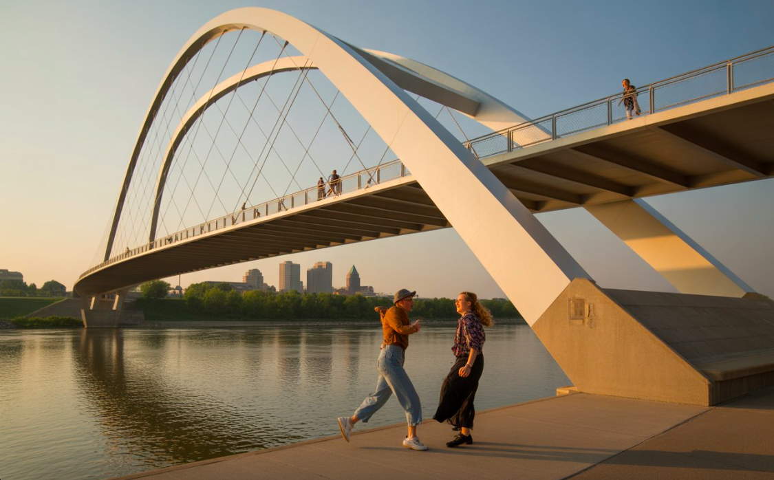 Walk Across The Bob Kerrey Pedestrian Bridge The Bob Kerrey Pedestrian Bridgeis a 3,000-foot pedestrian bridge that connects Nebraska and Iowa over the Missouri River. It offers beautiful skyline views and photo opportunities. Visitors love standing in two states at once on the marked state line. - Location: 705 Riverfront Dr, Omaha, NE 68102